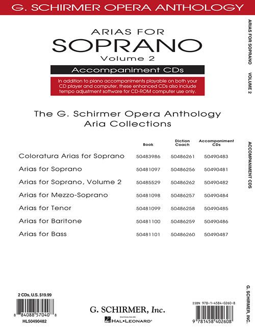 Arias for Soprano - Volume 2G. Schirmer Opera Anthology Accompaniment CDs (2)Publisher: G. Schirmer, Inc.Category: VocalSeries: Vocal CollectionFormat: CDThe companion accompaniment recordings to the best-selling series in the G. Schirmer Opera Anthology. Each aria is recorded...Regular price $29.99
