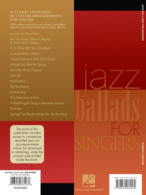 Jazz Ballads for Singers - Women's Edition15 Classic Standards in Custom Vocal Arrangements Women's EditionPublisher: Hal LeonardCategory: VocalSeries: Vocal CollectionFormat: Softcover Audio Online15 essential standards have been given new arrangements tailor-made for singers, with alternative jazz...Regular price $26.99 -