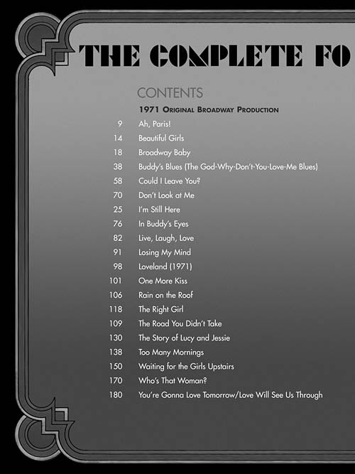 Composer: Stephen SondheimFollies - The Complete CollectionVocal SelectionsPublisher: Hal LeonardCategory: Keyboard & Piano/Vocal/GuitarSeries: Vocal SelectionsFormat: PaperbackThis unprecedented collection contains all of the songs from Follies: from the 1971 Broadway production, the 1987 London revival, and the...Regular price $47.99 -
