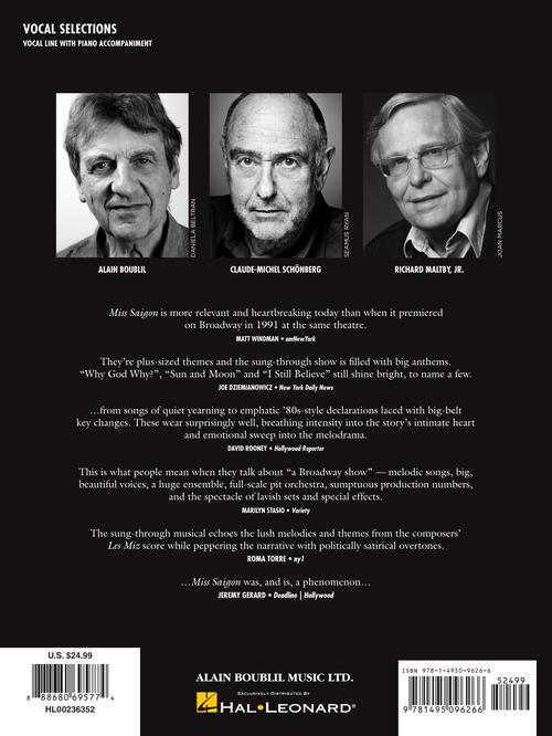 Composer: Alain BoublilMiss Saigon (2017 Broadway Edition)Vocal Line with Piano AccompanimentPublisher: Hal LeonardCategory: VocalSeries: Vocal PianoFormat: Softcover13 songs arranged for voice with piano accompaniment from the 2017 Broadway revival of this successful Boulil and Schönberg musical....Regular price $35.99 -