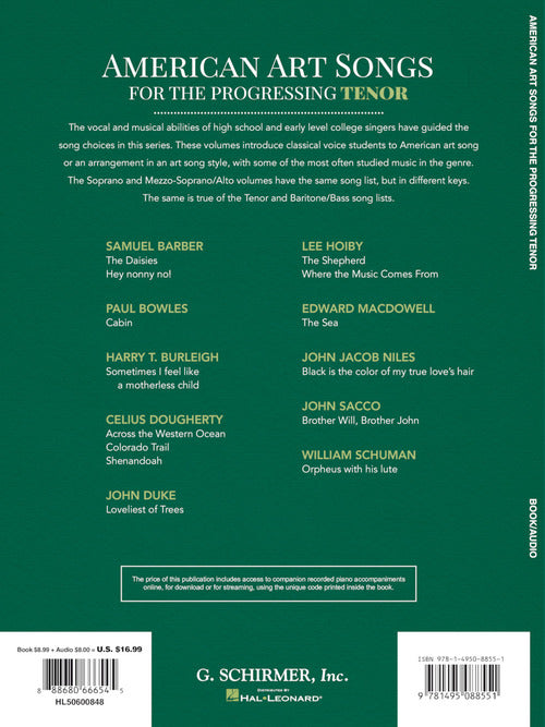 American Art Songs for the Progressing Singer - Tenor(With Online Accompaniments)Publisher: G. Schirmer, Inc.Category: VocalSeries: Vocal CollectionFormat: Softcover Audio OnlineThe vocal and musical abilities of high school and college singers have guided the song choices in...Regular price $20.99