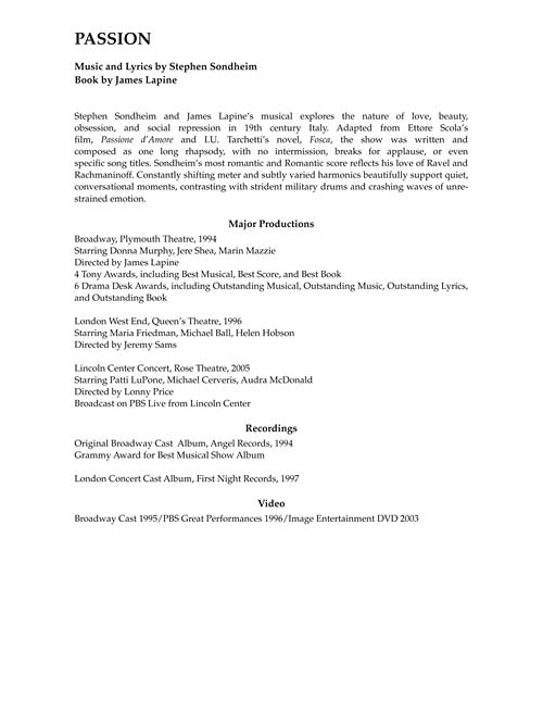 Composer: Stephen SondheimStephen Sondheim - Passion - Revised EditionVocal SelectionsPublisher: Hal LeonardCategory: Keyboard & Piano/Vocal/GuitarSeries: Vocal SelectionsFormat: PaperbackNewly edited, with new music engravings, added songs, articles and photos. Includes: Flashback · Happiness · I Read ·...Regular price $20.99 -