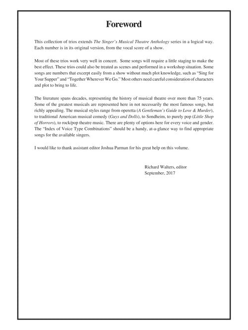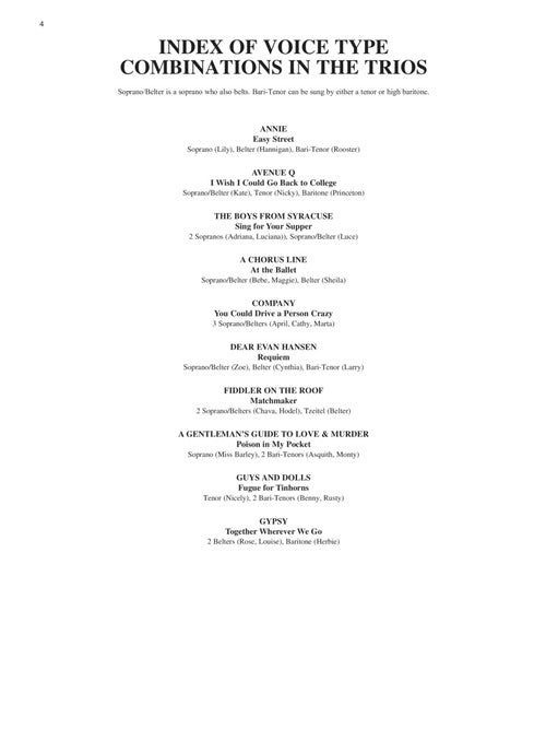 The Singer's Musical Theatre Anthology: Trios - Book/Online Audio20 Trios for Various Voice CombinationsPublisher: Hal LeonardCategory: VocalSeries: Vocal CollectionFormat: Softcover Audio OnlineA collection of songs from the musical stage, written for trios of various voice types....Regular price $53.99 -