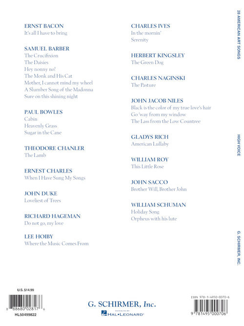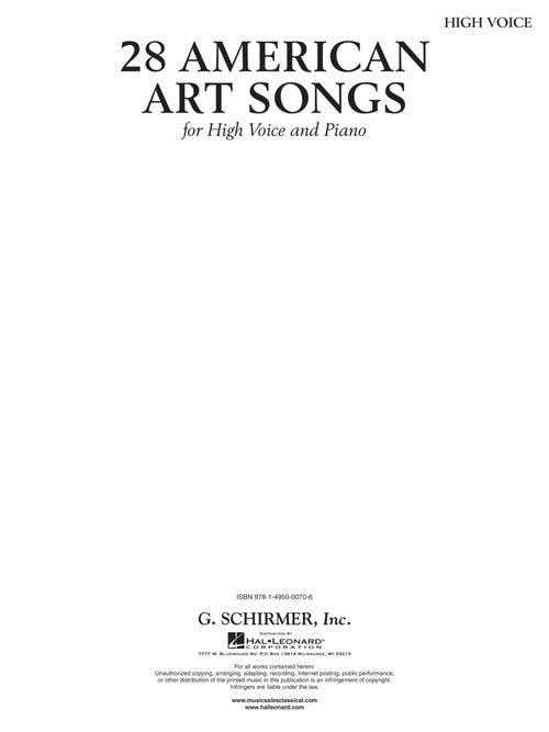 28 American Art SongsHigh Voice and PianoPublisher: G. Schirmer, Inc.Category: VocalSeries: Vocal CollectionFormat: SoftcoverSelected art songs by prominent American composers in the G. Schirmer and AMP catalog, including songs by Samuel Barber, John Duke, Lee Hoiby,...Regular price $23.99