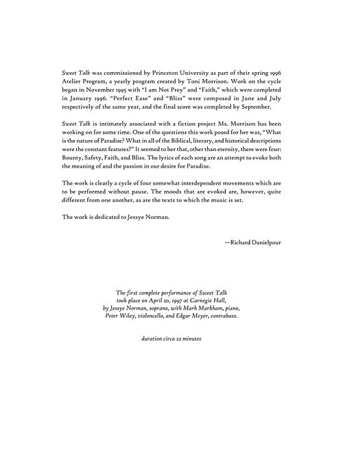 Composer: Richard DanielpourRichard Danielpour - Sweet TalkPublisher: Associated Music Publishers, Inc.Category: VocalSeries: Vocal CollectionFormat: PaperbackFour songs on texts by Toni Morrison. The lyrics are an attempt to evoke both the meaning of and the passion in...Regular price $47.99 -