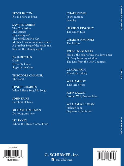 28 American Art SongsLow Voice and PianoPublisher: G. Schirmer, Inc.Category: VocalSeries: VocalFormat: SoftcoverSelected art songs by prominent American composers in the G. Schirmer and AMP catalog, including songs by Samuel Barber, John Duke, Lee Hoiby, Charles...Regular price $21.99 -