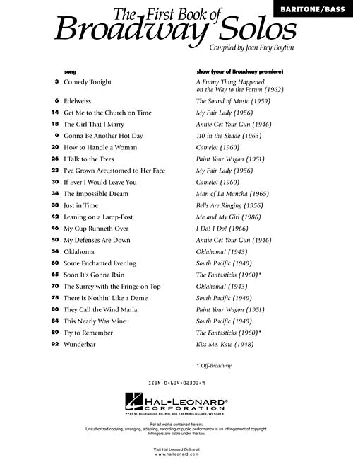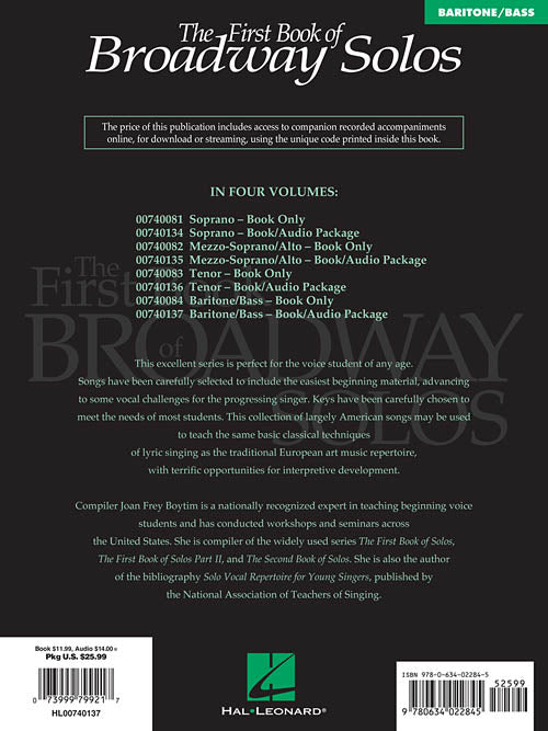 First Book of Broadway SolosBaritone/Bass EditionPublisher: Hal LeonardCategory: VocalSeries: Vocal CollectionFormat: Softcover Audio OnlineThis is the perfect first collection for many voice students, whether they are teens or college singers or adults. Joan Boytim has selected...Regular price $35.99 -