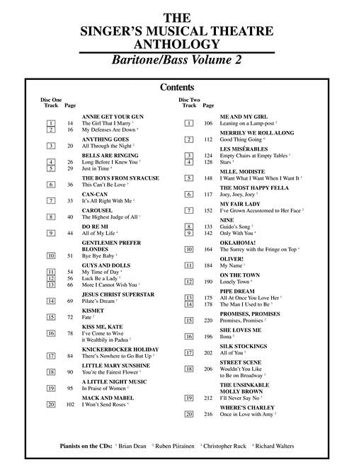 Singer's Musical Theatre Anthology - Volume 2Baritone/Bass Book with Online AudioPublisher: Hal LeonardCategory: VocalSeries: Vocal CollectionFormat: Softcover Audio OnlineContents: ANNIE GET YOUR GUN: The Girl That I Marry, My Defenses Are Down · ANYTHING GOES: All...Regular price $59.99 -