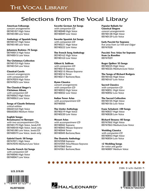 Arranger: Richard WaltersThe Lieder AnthologyThe Vocal Library Low VoicePublisher: Hal LeonardCategory: VocalSeries: Vocal CollectionFormat: PaperbackThis edition presents 65 diverse songs by major composers of German art song, or lieder, and is the perfect one-volume lieder source...Regular price $27.99 -
