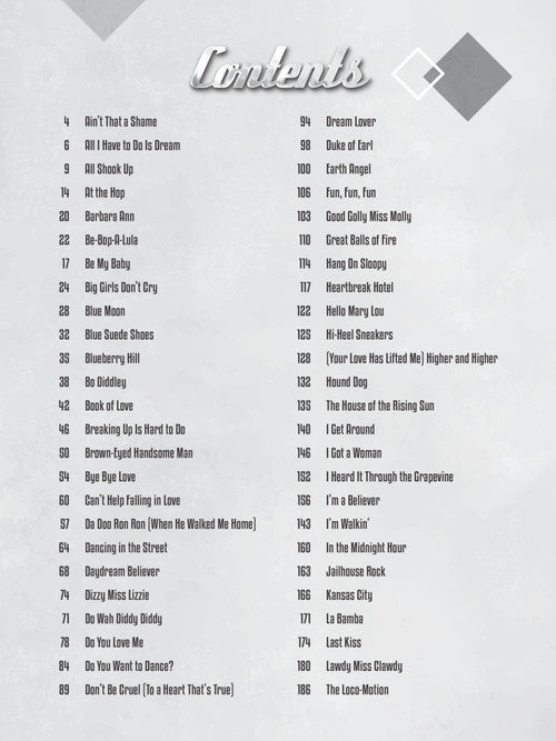 100 Rock 'n' Roll StandardsPublisher: Hal LeonardCategory: Keyboard & Piano/Vocal/GuitarSeries: Piano/Vocal/Guitar SongbookFormat: Softcover100 arrangements for piano, voice and guitar are included in this collection of hits from the early days of rock & roll. Songs include:...Regular price $33.99 -