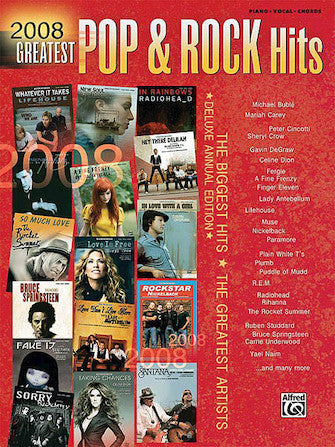 2008 Greatest Pop & Rock HitsGreatest HitsPublisher: Alfred Publishing Co.Category: Music Related ProductsSeries: Piano/Vocal/Guitar SongbookFormat: SoftcoverPick up the Deluxe Annual Edition of 2008 Greatest Pop & Rock Hits and play all the best songs of 2008...Regular price $23.99