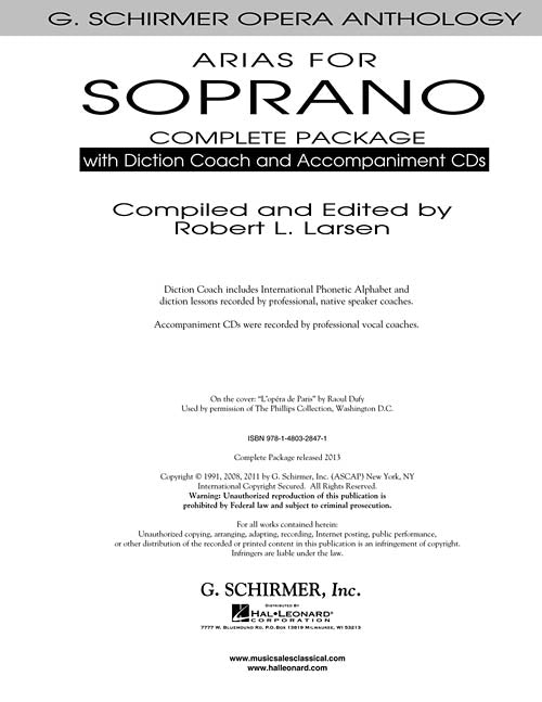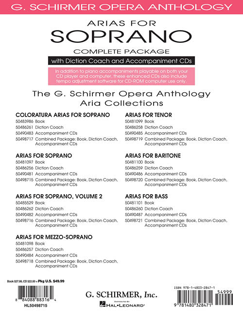 Arias for Soprano - Complete Packagewith Diction Coach and Accompaniment CDsPublisher: G. Schirmer, Inc.Category: VocalSeries: Vocal CollectionFormat: Softcover with CDThis all-in-one package includes the original Arias for Soprano book from the G. Schirmer Opera Anthology along...Regular price $59.99