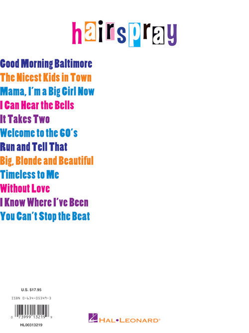 Composer: Marc ShaimanHairsprayPiano/Vocal SelectionsPublisher: Hal LeonardCategory: Keyboard & Piano/Vocal/GuitarSeries: Vocal SelectionsFormat: PaperbackTony-winning musical Hairspray is the latest feel-good Broadway blockbuster, based on the 1988 John Waters movie of the same title. The music is by Marc...Regular price $29.99 -