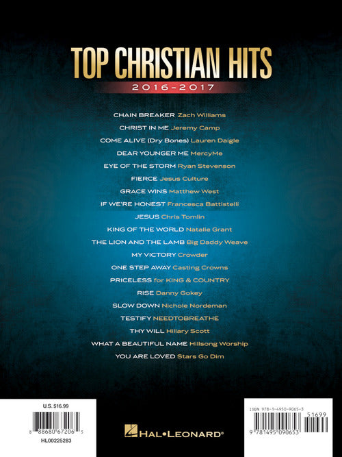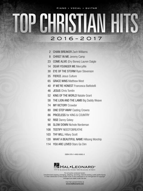 Top Christian Hits 2016-201720 Hit SinglesPublisher: Hal LeonardCategory: Keyboard & Piano/Vocal/GuitarSeries: Piano/Vocal/Guitar SongbookFormat: Softcover20 favorite releases, including: Chain Breaker · Christ in Me · Dear Younger Me · Eye of the Storm · Grace Wins ·...Regular price $20.99 -
