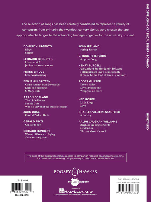 The Developing Classical SingerSongs by British and American Composers - SopranoPublisher: Boosey & HawkesCategory: VocalSeries: Boosey & Hawkes VoiceFormat: Softcover Audio OnlineThe selection of songs has been carefully considered to represent a variety of composers from...Regular price $20.99 -