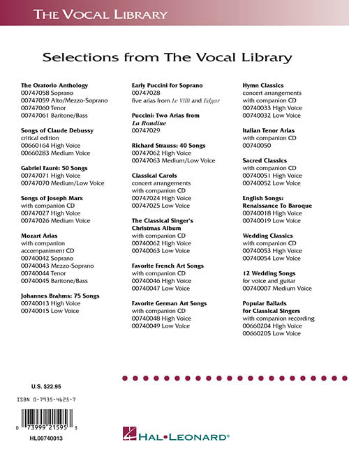 Composer: Johannes BrahmsJohannes Brahms: 75 SongsThe Vocal LibraryPublisher: Hal LeonardCategory: VocalSeries: Vocal CollectionFormat: PaperbackHistorical notes, about the composition of the song and its early performance history, are included for each song. A new line-by-line translation appears...Regular price $32.99 -