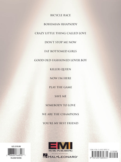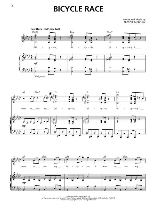 Artist: QueenQueenFor Singers with Piano AccompanimentSoftcover13 hits arranged for singers exactly how Freddie Mercury sang them, with piano accompaniment. Includes: Bicycle Race · Bohemian Rhapsody · Crazy Little Thing Called Love · Don't Stop Me Now...Regular price $23.99 -