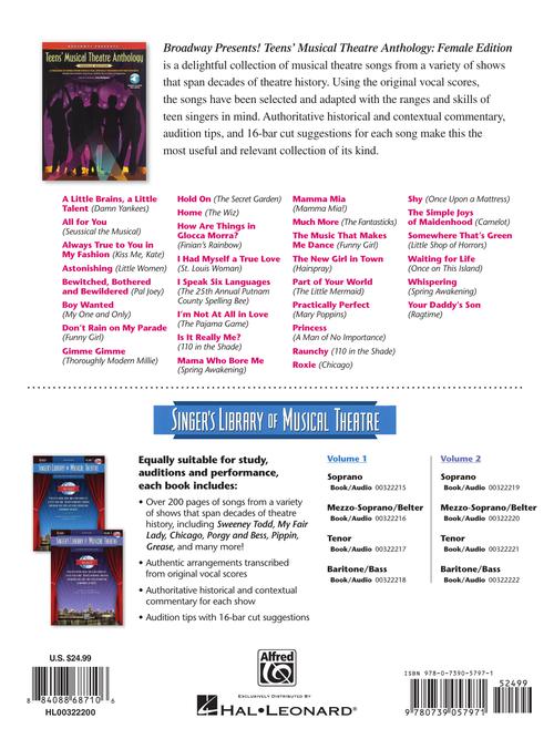 Broadway Presents! Teens' Musical Theatre Anthology: Female EditionA Treasury of Songs from Stage & Film, Specially Designed for Teen Singers!Publisher: Hal LeonardCategory: VocalSeries: Vocal CollectionFormat: Softcover Audio OnlineBroadway Presents! Teens' Musical Theatre Anthology: Female Edition is...Regular price $35.99 -