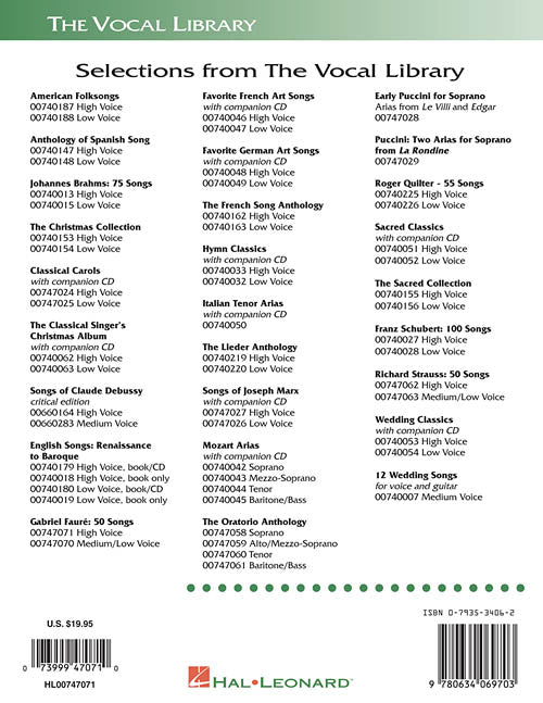 Composer: Gabriel FauréGabriel Fauré: 50 SongsThe Vocal Library High VoicePublisher: Hal LeonardCategory: VocalSeries: Vocal CollectionFormat: PaperbackA substantial new edition of this beloved art song literature, standard fare for collegiate singers, with 10 more songs than the...Regular price $27.99 -