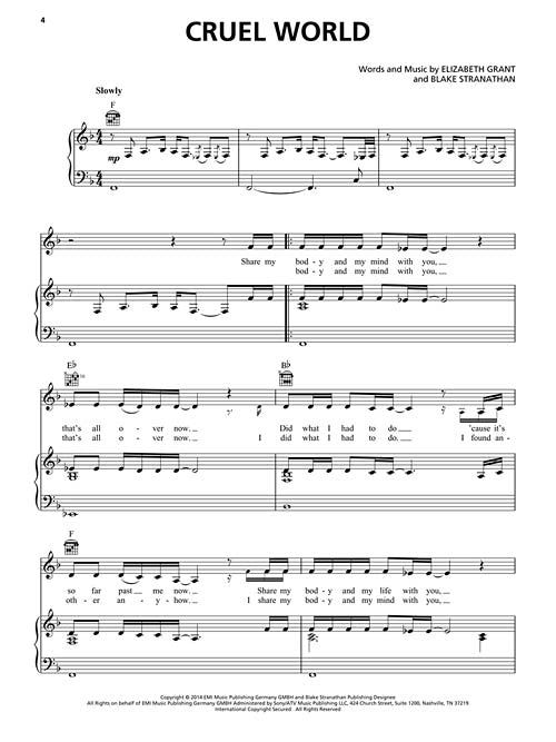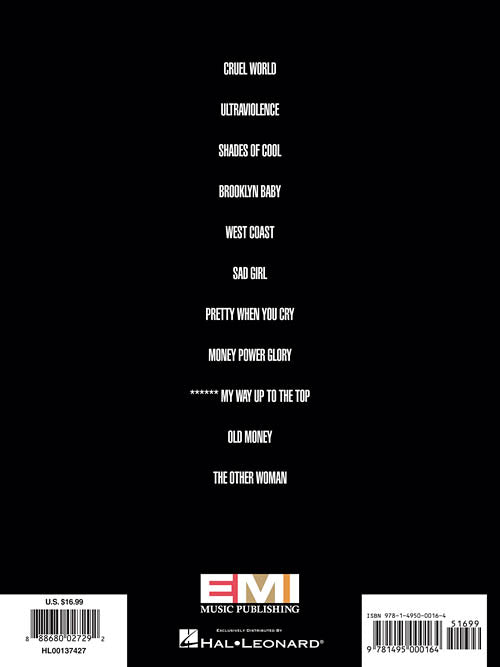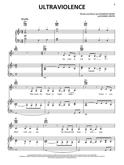Lana Del Rey - UltraviolencePublisher: Hal LeonardCategory: Keyboard & Piano/Vocal/GuitarSeries: Piano/Vocal/Guitar Artist SongbookFormat: SoftcoverThis chart-topping 2014 album release from Lana Del Rey is presented in piano/vocal/guitar arrangements for all 11 songs: Brooklyn Baby · Cruel World...Regular price $29.99 -