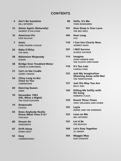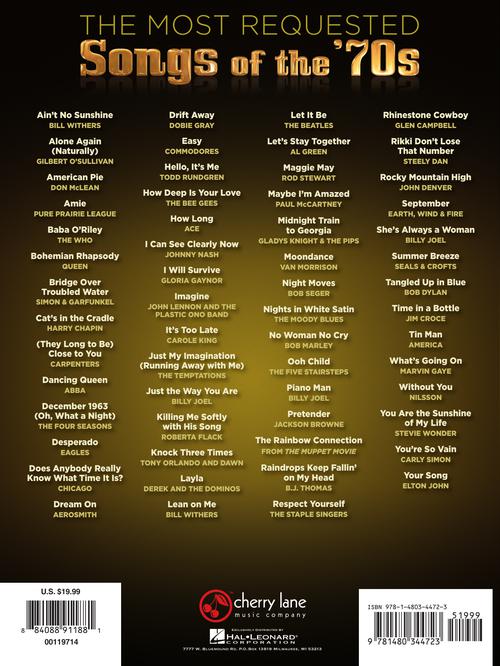The Most Requested Songs of the '70sPublisher: Cherry Lane MusicCategory: Keyboard & Piano/Vocal/GuitarSeries: Piano/Vocal/Guitar SongbookFormat: Softcover58 songs from the swingin' seventies, including: Ain't No Sunshine · American Pie · Baba O'Riley · Bohemian Rhapsody · Bridge...Regular price $35.99