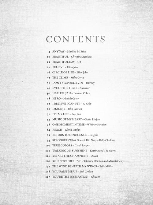 Hallelujah, Imagine & Other Songs of InspirationPublisher: Hal LeonardCategory: Keyboard & Piano/Vocal/GuitarSeries: Piano/Vocal/Guitar SongbookFormat: Softcover25 uplifting songs for piano, voice and guitar, including Hallelujah and Imagine plus: Beautiful Day · Circle of Life · Don't Stop...Regular price $23.99 -
