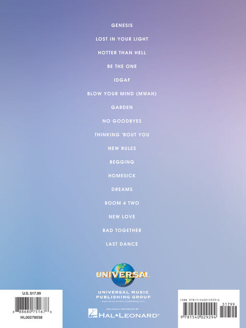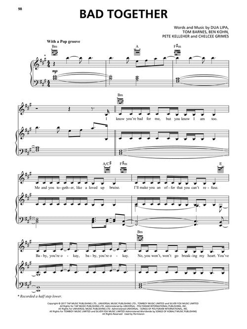 Dua LipaPublisher: Hal LeonardCategory: Keyboard & Piano/Vocal/GuitarSeries: Piano/Vocal/Guitar Artist SongbookFormat: Softcover17 songs from the self-titled album by the 2019 GRAMMY Award® winner for Best New Artist, Dua Lipa. Includes: Bad Together · Be the One ·...Regular price $21.99 -