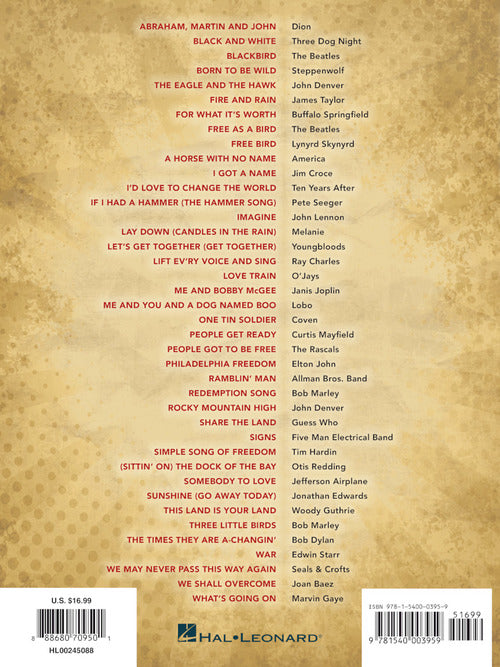 Freedom RockPublisher: Hal LeonardCategory: Keyboard & Piano/Vocal/GuitarSeries: Piano/Vocal/Guitar SongbookFormat: Softcover40 songs that defined an era, including: Abraham, Martin and John · Born to Be Wild · For What It's Worth · A Horse with No Name...Regular price $20.99 -