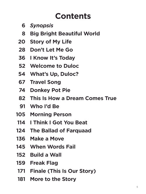 Shrek the MusicalPublisher: Cherry Lane MusicCategory: Keyboard & Piano/Vocal/GuitarSeries: Piano/Vocal/Guitar SongbookFormat: PaperbackFeatures 18 piano/vocal selections from this Broadway hit that won both Tony and Drama Desk awards. Includes a plot synopsis, four pages of sensational color...Regular price $35.99 -