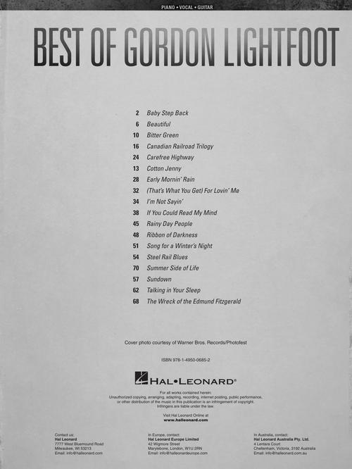 Best of Gordon LightfootPublisher: Hal LeonardCategory: Keyboard & Piano/Vocal/GuitarSeries: Piano/Vocal/Guitar Artist SongbookFormat: Softcover18 of the best-loved songs from this legendary folk rock singer/songwriter are presented for piano, voice and guitar: Carefree Highway · Early Mornin' Rain...Regular price $29.99 -