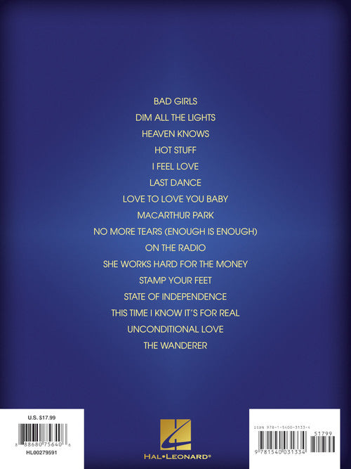 Best of Donna SummerPublisher: Hal LeonardCategory: Keyboard & Piano/Vocal/GuitarSeries: Piano/Vocal/Guitar Artist SongbookFormat: Softcover16 of the best known songs from this Grammy® Award-winning disco star now immortalized with a Broadway show celebrating her life and music. Our...Regular price $21.99 -