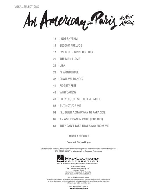 An American in ParisVocal Line with Piano AccompanimentPublisher: Hal LeonardCategory: Keyboard & Piano/Vocal/GuitarSeries: Vocal SelectionsFormat: Softcover14 selections from the Tony Awardยฎ-winning production presented in vocal line arrangements with piano accompaniment. Includes: An American in Paris ยท...Regular price $21.99 -