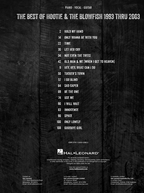 The Best of Hootie & The Blowfish: 1993 Thru 2003Publisher: Hal LeonardCategory: Keyboard & Piano/Vocal/GuitarSeries: Piano/Vocal/Guitar Artist SongbookFormat: SoftcoverThis songbook provides 17 piano/vocal/guitar arrangements from Darius Rucker's old band that ruled the airwaves in the 1990s...Regular price $23.99 -