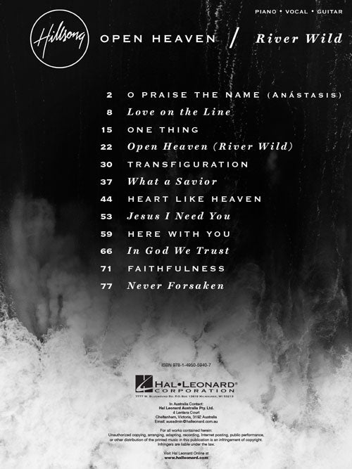 Hillsong Worship - Open Heaven/River WildPublisher: Hal LeonardCategory: Keyboard & Piano/Vocal/GuitarSeries: Piano/Vocal/Guitar Artist SongbookFormat: Softcover12 songs from the live worship album from Australia's Hillsong Church. Includes: Faithfulness · Heart like Heaven · Here with You ·...Regular price $20.99