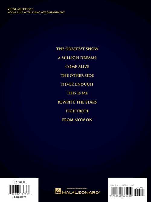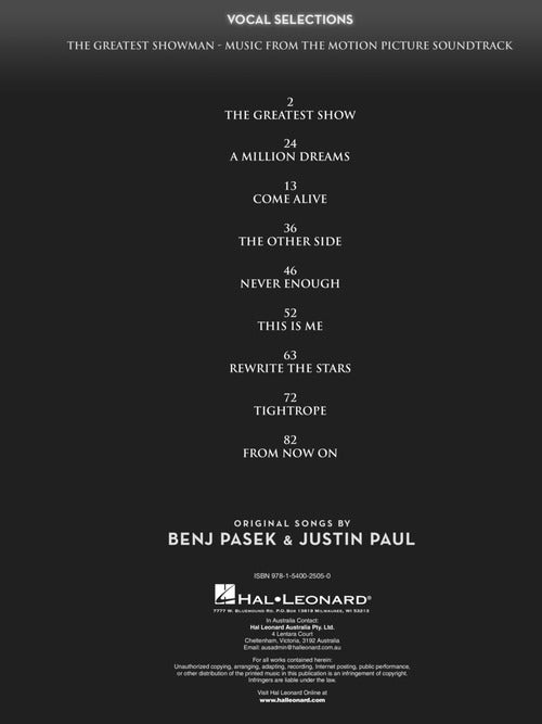 Composer: Benj PasekThe Greatest Showman - Vocal SelectionsVocal Line with Piano AccompanimentPublisher: Hal LeonardCategory: VocalSeries: Vocal SelectionsFormat: SoftcoverA musical drama biopic chronicling P.T. Barnum (played by Hugh Jackman) and his founding of the Barnum & Bailey...Regular price $31.99 -