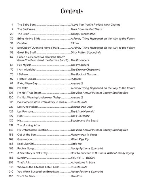 Composer: VariousTheatre and Cabaret Comedy Songs - Men's EditionSoftcoverA collection of the funniest songs written for the stage and screen. Songs include: The Baby Song from I Love You, You're Perfect, Now Change · The Bad...Regular price $29.99 -
