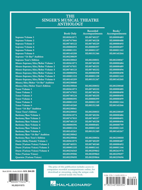 The Singer's Musical Theatre Anthology: Duets, Volume 4 - Book/Online AudioBook/Online AudioPublisher: Hal LeonardCategory: VocalSeries: Vocal CollectionFormat: Softcover Audio OnlineA collection of songs from the musical stage, written for duets of various voice types. The selections...Regular price $53.99 -