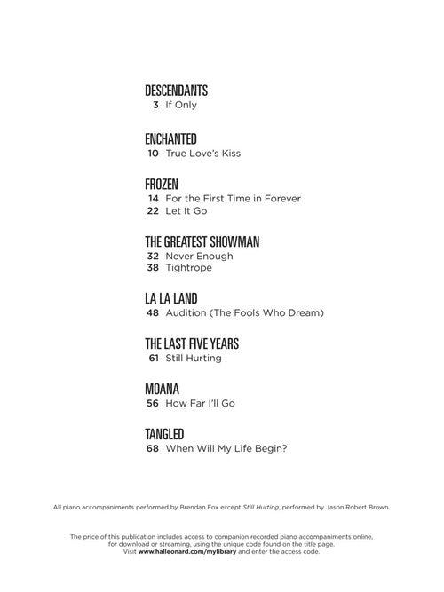 Songs from 21st Century Movie Musicals for Women SingersPublisher: Hal LeonardCategory: VocalSeries: Vocal CollectionFormat: Softcover Audio OnlineTen songs from contemporary movie musical hits for female singers, with access to recorded piano accompaniment tracks online for download...Regular price $23.99 -