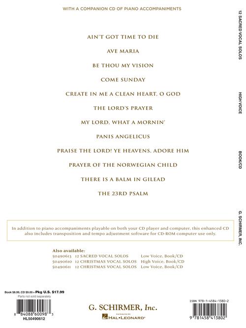 12 Sacred Vocal Solos for Classical SingersHigh Voice Edition With a CD of Piano AccompanimentsPublisher: G. Schirmer, Inc.Category: VocalSeries: VocalFormat: Softcover with CDSelection of sacred songs and spirituals that are appropriate for classical singers. Suitable for...Regular price $21.99 -