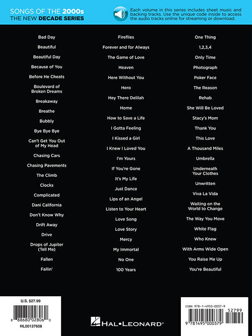 Songs of the 2000sThe New Decade Series with Online Play-Along Backing TracksPublisher: Hal LeonardCategory: Keyboard & Piano/Vocal/GuitarSeries: Piano/Vocal/Guitar SongbookFormat: Softcover Audio OnlineThe New Decade Series provides great synopses of the musical decades and lets you play...Regular price $41.99 -