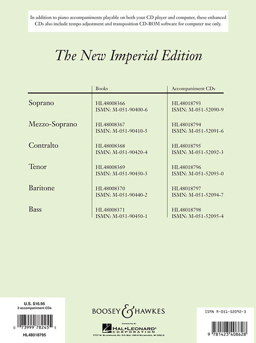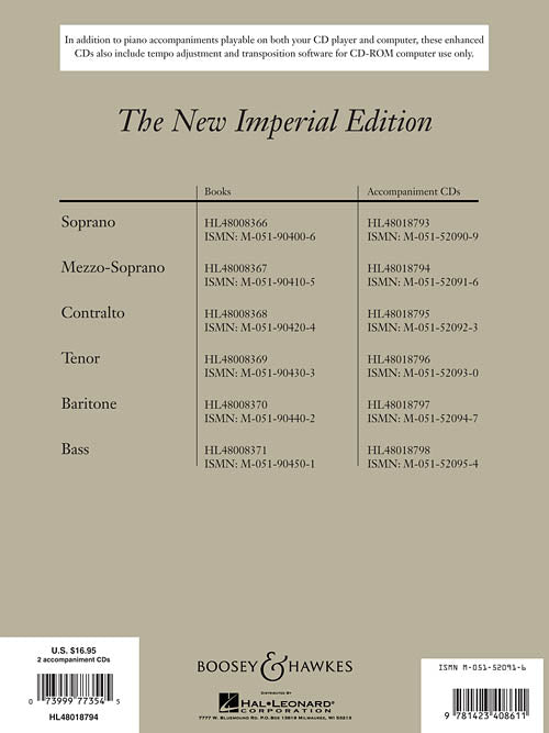 The New Imperial EditionAccompaniment CDs Bass SongsPublisher: Boosey & HawkesCategory: VocalSeries: Boosey & Hawkes VoiceFormat: CDThese collections of 30 songs each, released over 50 years ago, have been a mainstay of classical vocal study. There is...Regular price $23.99 -