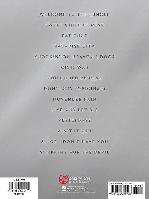 Guns N' Roses - Greatest HitsPublisher: Cherry Lane MusicCategory: Keyboard & Piano/Vocal/GuitarSeries: Piano/Vocal/Guitar Artist SongbookFormat: Paperback14 rock anthems from the great GN'R, in artist-approved P/V/G arrangements: Civil War · Don't Cry · Knockin' on Heaven's Door...Regular price $23.99