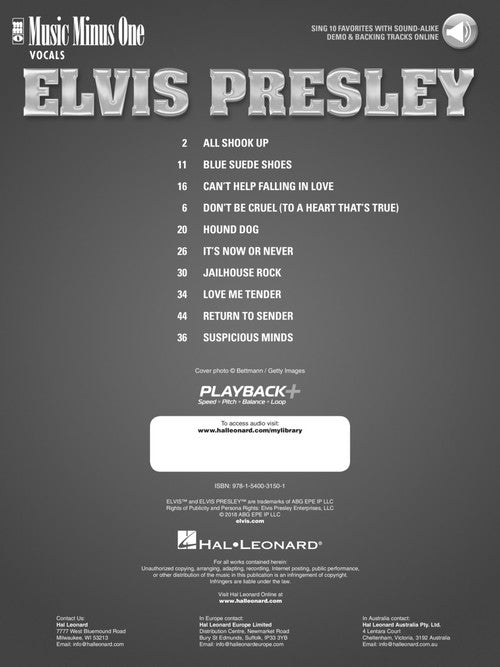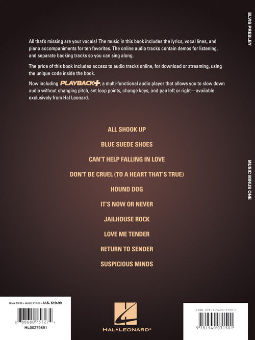Elvis PresleyMusic Minus One Vocals 10 Favorites with Sound-Alike Demo & Backing TracksPublisher: Music Minus OneCategory: VocalSeries: Music Minus OneFormat: Softcover Audio OnlineAll that's missing are your vocals! 10 timeless classics from The King are presented...Regular price $23.99