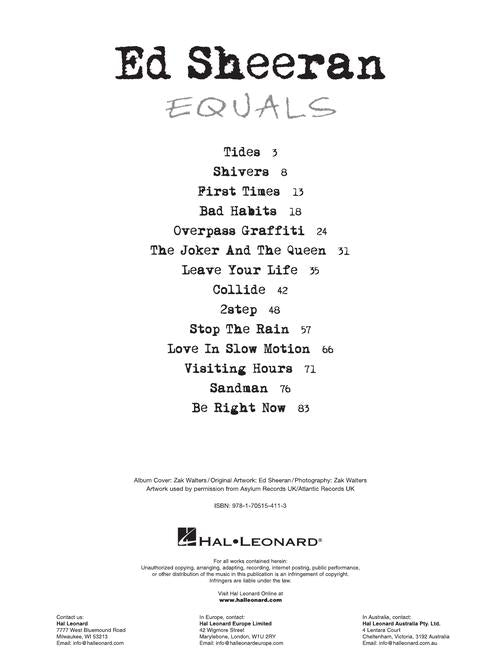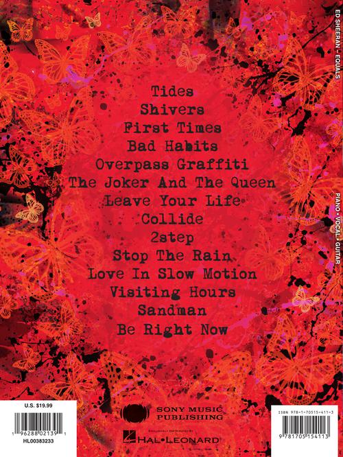 Ed Sheeran - EqualsPublisher: Hal LeonardCategory: Keyboard & Piano/Vocal/GuitarSeries: Piano/Vocal/Guitar Artist SongbookFormat: SoftcoverEd Sheeran calls his long-awaited 2021 release his coming-of-age record. Our matching folio features all 14 of its tracks arranged for piano and voice...Regular price $23.99 -