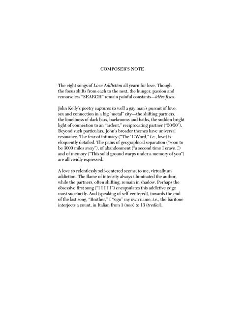 Composer: David Del TrediciLove AddictionBaritone Voice and PianoPublisher: Boosey & HawkesCategory: VocalSeries: Boosey & Hawkes VoiceFormat: SoftcoverA cycle of eight songs for baritone voice and piano based on the poetry of John Kelly.Inventory # : 48021038UPC:...Regular price $27.99 -
