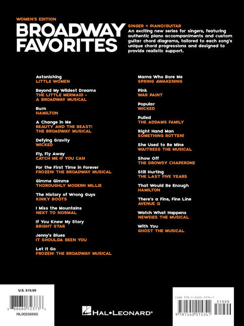Composer: VariousBroadway Favorites - Women's EditionSinger + Piano/GuitarPublisher: Hal LeonardCategory: VocalSeries: Vocal Sheet MusicFormat: SoftcoverThe Hal Leonard Vocal Sheet Music series is an exciting new series for singers, featuring authentic piano accompaniments and custom guitar chord...Regular price $23.99 -