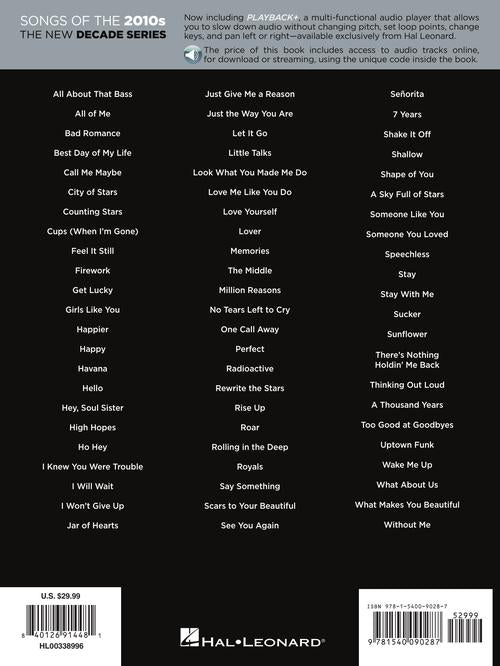 Songs of the 2010s - Updated EditionThe New Decade Series with Online Play-Along Backing TracksPublisher: Hal LeonardCategory: Keyboard & Piano/Vocal/GuitarSeries: Piano/Vocal/Guitar SongbookFormat: Softcover Audio OnlineThe New Decade Series provides great synopses of the musical decades and...Regular price $47.99 -