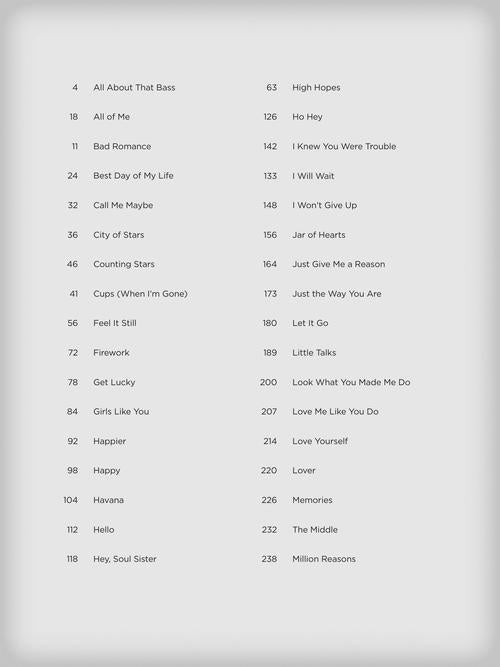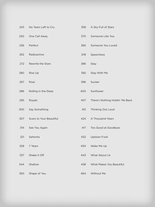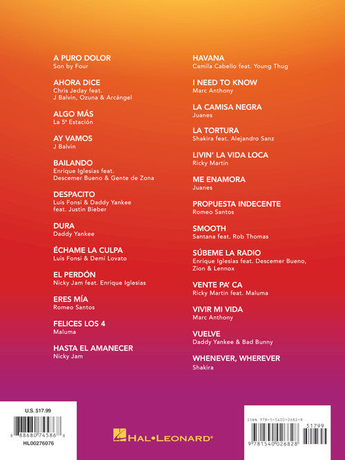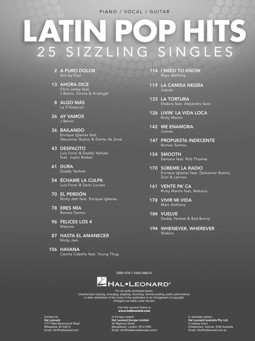 Latin Pop Hits25 Sizzling SinglesPublisher: Hal LeonardCategory: Keyboard & Piano/Vocal/GuitarSeries: Piano/Vocal/Guitar SongbookFormat: Softcover25 hot contemporary Latin songs arranged for piano, voice and guitar, including: Ahora Dice (Chris Jeday) · Bailando (Enrique Iglesias) · Despacito (Luis Fonsi...Regular price $21.99 -