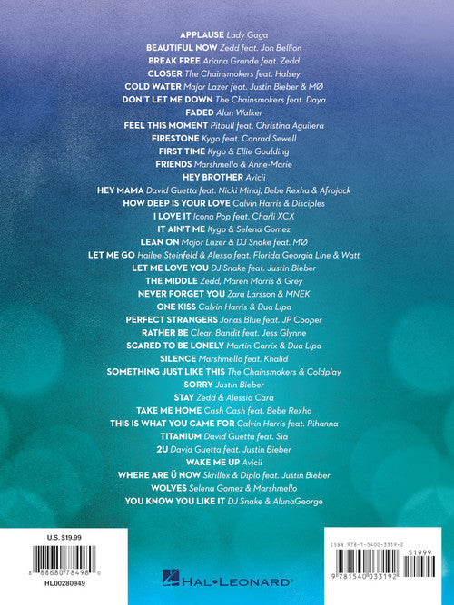 EDM Sheet Music Collection37 Electronic Dance Music HitsPublisher: Hal LeonardCategory: Keyboard & Piano/Vocal/GuitarSeries: Piano/Vocal/Guitar SongbookFormat: Softcover37 hits from the EDM genre are featured in this collection for piano, voice and guitar. Includes: 2U (David Guetta feat....Regular price $23.99 -