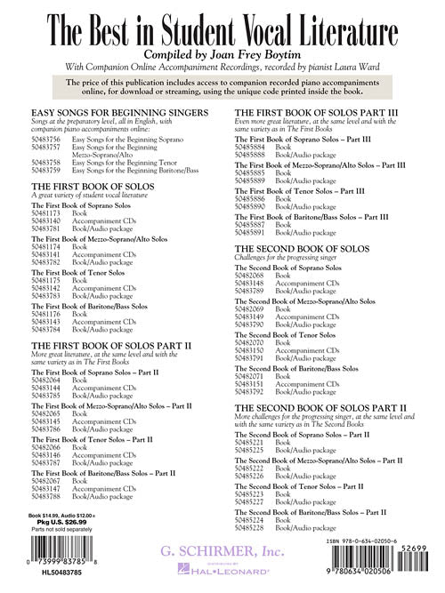 The First Book of Soprano Solos - Part IIBook/Online AudioPublisher: G. Schirmer, Inc.Category: VocalSeries: Vocal CollectionFormat: Softcover Audio OnlineMore great teaching material at the same level as the first volume. Over 30 songs in each volume...Regular price $35.99 -